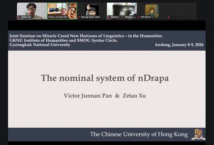 Prof Victor Pan delivered an invited talk co-authored with Zetao Xu entitled “The Nominal System in nDrapa” at 2026 Joint Seminar on Miracle Creed New Horizons of Linguistics – in the Humanities, hosted by GKNU Institute of Humanities and SMOG Syntax Circle, Gyeongkuk National University, Andong, South Korea, January 9.